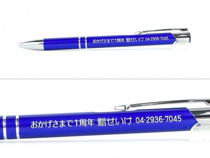 ご注文いただいたのは 名入れボールペン市場オリジナルのメタリックONEボールペン。オリジナルボールペンのなかで最も人気の高い名入れボールペンです。メタリックカラーの青いボディに白の印刷がとても美しいネーム入りボールペンは記念品や販促品として華を添えてくれる1本です。