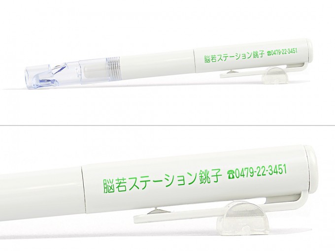 今回ご注文いただいたのは、名入れボールペンオリジナル商品のホイッスル付ライトペン。ボールペン・LEDライト・ホイッスルと3つの機能を兼ね備えたとても便利な1本です。防犯や防災にとても重宝するとのお客様の声をいただいております。こちらの商品は本体色が白になりますのでどの色の印刷色でも名入れが映えます。今回は、緑色の印刷色で非常に爽やかな印象に仕上がりました。