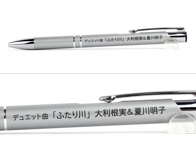。メタリック調のボディは高級感があり、オリジナルボールペンの中でも特に人気のある商品になっています。銀色の本体色に黒の名入れでしっかりと印刷されていますので宣伝効果も期待される仕上がりになっています。