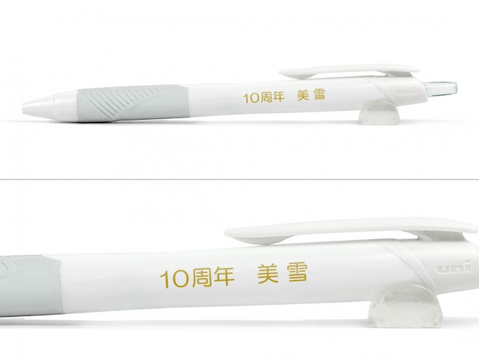 今回名入れボールペン市場にご注文いただいたのは三菱鉛筆UNI ジェットストリーム(名入れ専用品)0.7mmです。不動の人気を誇るジェットストリームシリーズの白軸タイプです。こちらの商品は名入れ専用品になっていますので一般の文具店には置いていない商品です。本体軸は白ですがグリップの色が5色ありますのでお好きな色をお選びいただけます。今回は白のタイプをご注文いただき印刷色は金で華やかな印象に仕上がりました。
