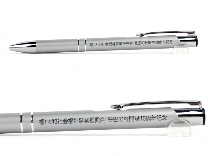 です。ボールペン市場においてNO.1を誇る人気のボールペンに印刷をしてお届け致しました。銀色の本体色に黒ではっきりとした名入れになりました。開設10周年記念にお配りになるということでしたのでのし箱へも印字を行っております。