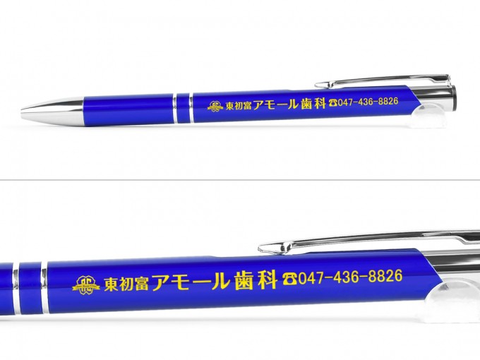 今回名入れボールペン市場にご注文いただいたのは、オリジナルボールペンのメタリックONEボールペンです。お名前の前にロゴを入れたいとのご希望で、データを頂き印刷を致しました。アモール歯科様のイメージカラーが青・黄色ということで、青の本体色に黄色の印刷をさせて頂いてます。