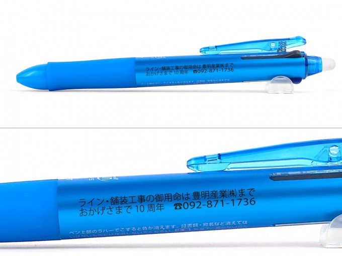 です。消せるボールペンとして人気の高いフリクションの3色ボールペンになっています。本体色はライトブルーと爽やかな色をお選びいただき、印刷色を黒にして引き締まった印象のボールペンに仕上がりました。会社の10周年の記念品としてお作りになられのし箱を添付してお届けしています。