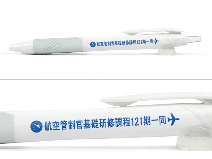 です。滑らかでクセになる書き味が人気のボールペンになってます。本体は名入れ専用の白軸になってますので青の印刷色が映えキレイな仕上がりになりました。文字の前にはデータ入稿して頂いたロゴ・文字の後ろには弊社オリジナルのロゴが入りました。