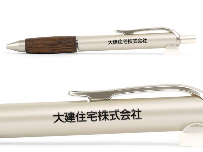 今回名入れボールペン市場にご注文いただいたのは、三菱鉛筆ピュアモルト500です。グリップ部分にウイスキー熟成後の樽材を再加工した味わいのある木を使い作られたボールペンです。樽材を使用してますので、ボールペンでありながら握った感触が肌にやさしくぬくもりを感じられる商品です。今回は本体色ダークブラウン・ナチュラルに黒の印刷色で作成いたしました。会社名のみのシンプルな印刷がより効果的な印象を与えてくれています。