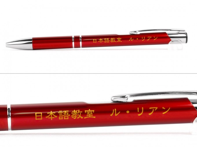です。名入れボールペン市場の売れ筋ランキングNO.1ボールペンです。光沢のある美しいカラーとスリムなボディが高級感を漂わせます。メタリックONEボールペンは印刷サイズの横幅が広いので20文字前後くらいであればキレイに入ります。今回は本体色 赤に金の名入れですので華やかで高級感漂う仕上がりになっています。