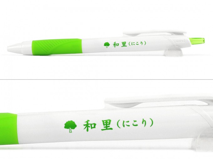 今回名入れボールペン市場にご注文いただいた名入れペンは三菱UNIブランドのジェットストリーム( 名入れ専用品)0.7mmです。滑らかな書き心地で人気の高いジェットストリームシリーズの中の名入れ専用白軸になります。名前の前に木のロゴを入れイメージカラーである緑色で印刷を致しました。グリップカラーの黄緑と印刷カラーの緑がとてもマッチして優しく癒されるボールペンに仕上がりました。ジェットストリームシリーズは価格や素材、機能など数多くラインナップしております。