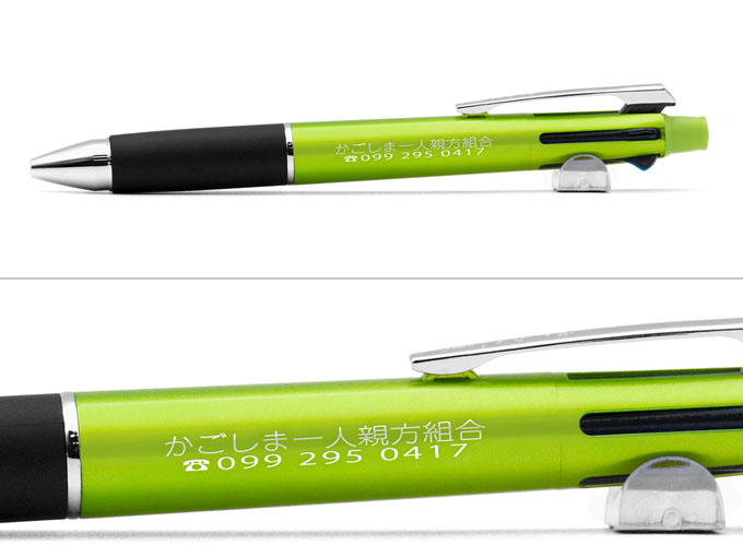 今回名入れボールペン市場にご注文頂いたボールペンは三菱uniブランドのジェットストリーム4&1 5機能ペン0.7mmです。くせになる滑らかな書き味でおなじみのジェットストリームシリーズです。ジェットストリームインク4色のボールペンとシャープペンシルがついた便利な多機能ペンに白の名入れ色で名入れしました。文字がしっかり目立ちキレイな名入れボールペンに仕上がりました。本体はメタリック調の塗装が施されており、価格に見合った高級感のある仕上がりになっております。