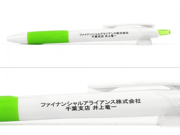 です。書きやすさが自慢のジェットストリーム、中でも名入れ専用の白軸になっていますので宣伝効果抜群のボールペンです。今回は本体5色あるうち4色を選択いただき印刷を行いました。写真は爽やかな白黄緑のグリップ色に黒の名入れ色でしっかりと印刷がされています。