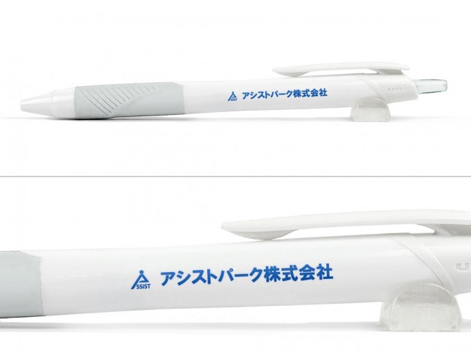 本体色5色の中から白を選択。データを入稿していただき会社ロゴ・会社名を青で印刷いたしました。とてもシンプルな印刷ですが、青の印刷色が目をひくカッコイイ仕上がりになりました。三菱鉛筆ブランドの中の不動の人気を誇るボールペンですので、迷ったらジェットストリームで間違いなしですね!