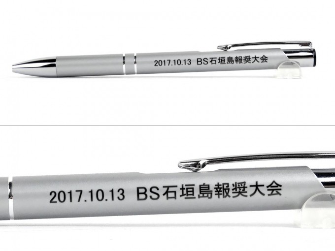 今回名入れボールペン市場にご注文頂いたペンは、オリジナルペンのメタリックONEボールペン 0.7mmです。高級感のある金属製ボールペンでシンプルなデザインが美しいスタイリッシュな商品です。こちらの商品は横幅が広く取れますので長文でも綺麗な仕上がりになります。銀の本体色に黒での印字はカッコイイ仕上がりになっています。
