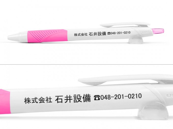 今回名入れボールペン市場にご注文頂いたのは三菱uniブランドのジェットストリーム名入れ専用品 0.7mmです。数あるジェットストリームシリーズの中でも名入れが一番きれいに映える名入れ専用品白軸です。黒の印刷色で会社名・電話番号を印字させて頂きました。実用度の高いボールペンに仕上がりました。