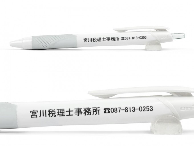 今回名入れボールペン市場にご注文頂いた名入れペンは三菱uniのジェットストリーム名入れ専用品0.7mmです。数あるジェットストリームシリーズの中でも名入れが一番きれいに映える名入れ専用品白軸です。黒での印刷色は文字がキレイに印刷されています。実用度の高いボールペンに仕上がっています。こちらのボールペンは白軸ですのでフルカラー印刷も対応しております。ノベルティや販促品として会社のロゴをフルカラーで表現して名入れ希望の場合にもオススメの名入れペンです。