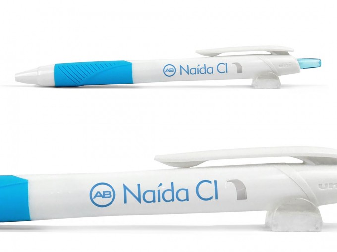 国産ボールペンの中でもその書きやすさからとても人気のあるジェットストリームシリーズ。その中でも名入れがとても際立つ白軸になっています。今回は本体色 白水色にフルカラー印刷をいたしました。