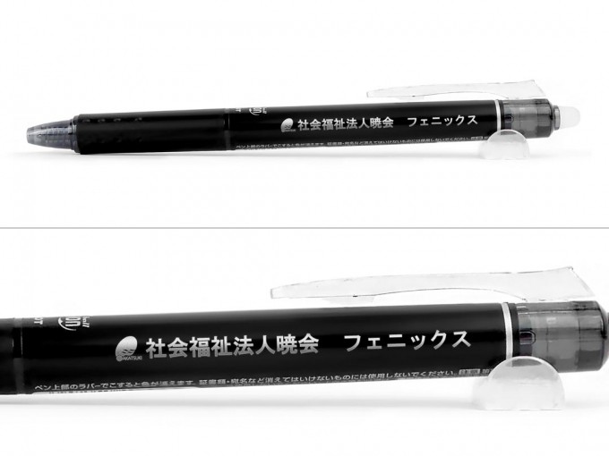この度名入れボールペン市場にご注文いただいたのは何度書いても何度でも消せる不思議なボールペン フリクションボールノック0.5mm。筆跡を専用ラバーでこすることでインクの色が透明になるという仕組み。消しカスも出ないのでどこでもお使いいただくことが出来ます。本体ブラックにシルバーの印刷色は落ち着きのあるシックなイメージに仕上がり、とてもおススメの印刷色です。記念品・販促品と幅広くご利用いただける人気のボールペンに名入れをして活用する企業様が増えています。