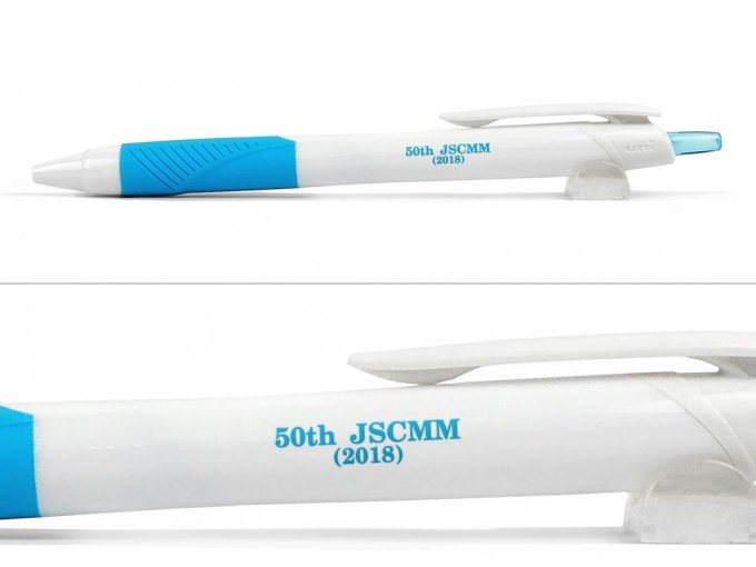 です。国産ボールペン人気ナンバーワン!くせになるなめらかな書き味でおなじみのジェットストリーム。その中でも名入れが一番きれいに映える名入れ専用品白軸です。水色での印刷は爽やかな感じに仕上がっており50周年に相応しい名入れボールペンになっています。