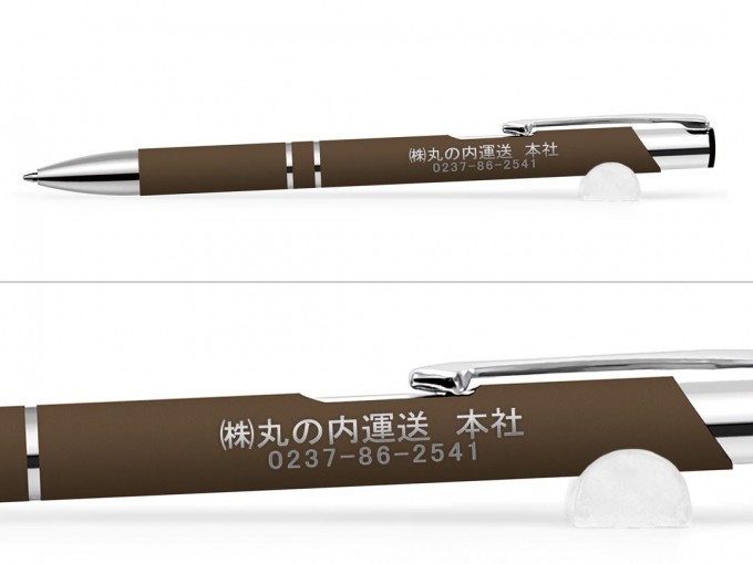 です。高級感のある金属製のボディにマットでさらさらした手触りが心地よいオリジナルボールペンです。名入れのデザインは2行校正でご依頼いただきましたので、PAD印刷(印刷範囲が広く取れる印刷方法)で対応させて頂きました。銀での名入れはカッコイイ仕上がりになりました。