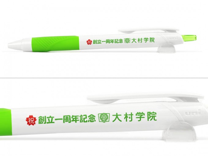 今回名入れボールペン市場にご注文頂いたのは国産ボールペンブランド三菱UNIのジェットストリーム名入れ専用品 0.7㎜です。国産メーカーのボールペンの中でも書きやすさに定評のあるジェットストリームシリーズの名入れ専用白軸バージョンのペンに赤と緑の2色印刷でお名前を入れました。本体グリップの白黄緑に併せた印刷色で統一感のある仕上がりになり、POP体の書体が柔らかいイメージを演出したボールペンになりました。
