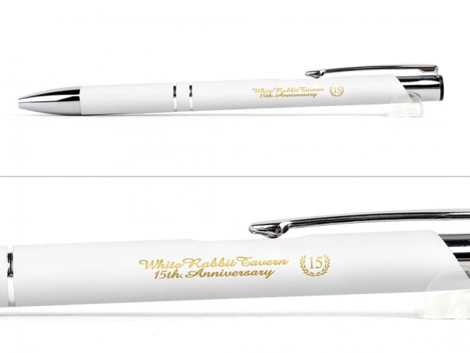 今回ご注文頂きました商品は弊社オリジナルのメタリックONE ボールペン 0.7mmです。光沢のある美しいカラーとスリムなボディが上品な雰囲気を漂わせています。弊社売れ筋ランキングNO.1のボールペンです。ゴールドでの印刷は15周年に相応しい、高級感あふれる仕上がりになっております。イラストの数字を15に変えさせて頂き印刷させて頂きました。