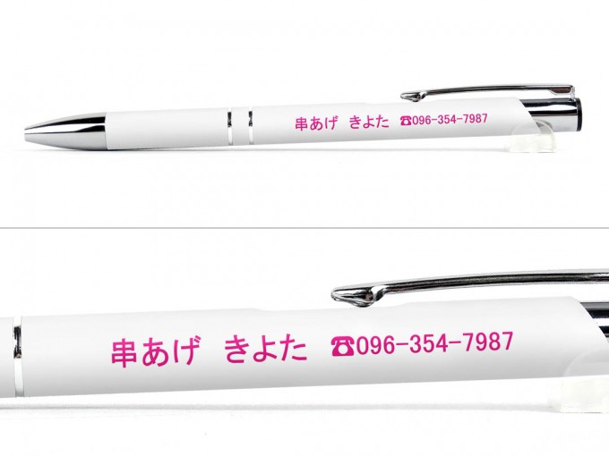 今回名入れボールペン市場にご注文頂いたのは弊社オリジナルのメタリックONE ボールペン 0.7mmです。販売当初から注文殺到の大人気商品です。高級感のある金属製ボールペンでシンプルなデザインが美しいスタイリッシュなボールペンです。お名前と電話番号が印刷されていますので宣伝効果バツグンです。白軸ボディはどんな印刷色も映え印刷内容がとても目立ちます。
