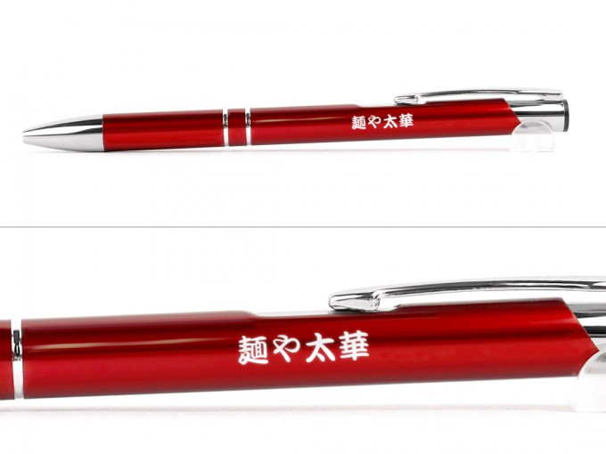今回名入れボールペン市場にご注文頂いた商品は弊社オリジナルボールペンのメタリックONEボールペン0.7mmです。名入れボールペン市場売上NO.1、メタリックONEシリーズです。光沢のある美しいカラーとスリムなボディが上品な雰囲気を漂わせます。店名を白の印刷色、勘亭流の書体で印刷させて頂きました。文字がしっかり目立ちインパクトのある仕上がりになりました。