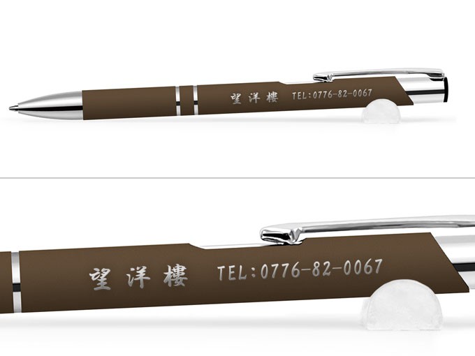 名入れボールペンを制作させて頂いたのは、お客様から好評を頂いている弊社オリジナルのメタリックONE-DX ボールペン 0.7mmです。スエード調加工を施していますのでさらさらした手触りが心地よく艶有り塗装よりペンを握った時に滑りづらく疲れも軽減されます。茶色の本体にシルバーでの印刷は落ち着いた感じに仕上がっておりボールペンのデザインと合っています。