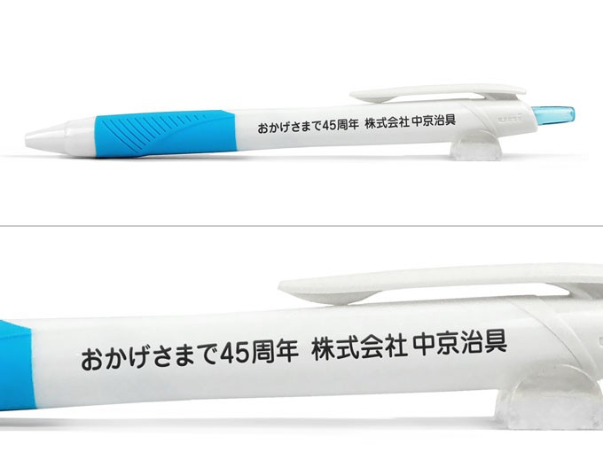 今回名入れボールペン市場にご注文頂いたのは三菱uniジェットストリーム名入れ専用品 0.7㎜です。従来の油性ボールペンと比較して最大40%も低い筆記抵抗でなめらかな書き味を実現し、優れた速乾性によりにじみにくいという万能タイプのインクを使用しております。名入専用ボールペンですので販促品として配布するのに最適です。丸ゴシック体での印刷は文字が目立ち優しい感じに仕上がっています。OPP(ナイロン製透明袋)を添付させて頂きました。