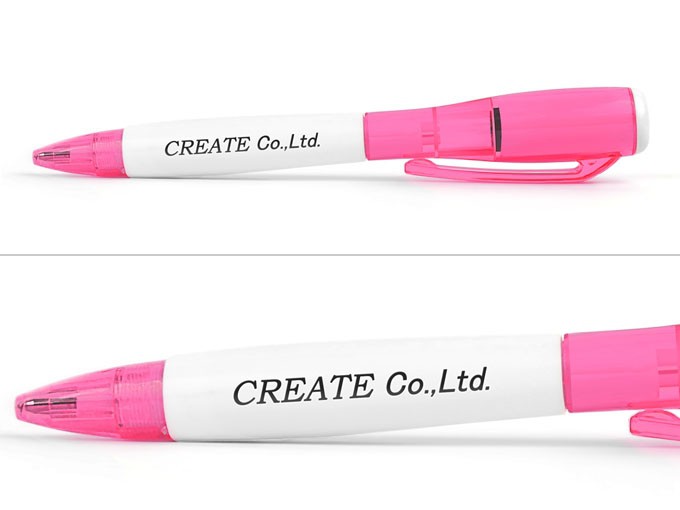 カラフルな本体色が女性や子供に人気の弊社オリジナルのLEDフラッシュライトボールペン パステルに名入れさせて頂きました。LEDライトが付いていますので暗闇を照らしたり、災害時などに役立ちます。白軸部分に名入れしますのでどんな印刷色でも映えます。会社名を英字で印刷させて頂きました。カッコイイ仕上がりになっています。