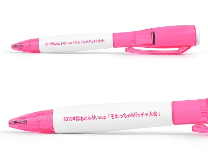 今回ご注文頂きました商品は弊社オリジナルボールペンのLEDフラッシュライトボールペン パステルです。白軸の本体ですので、お好きなカラーで印刷が出来ます。印刷文字に平仮名や、イラストを入れることにより全体的に可愛らしくふんわりとした仕上がりになりました。
