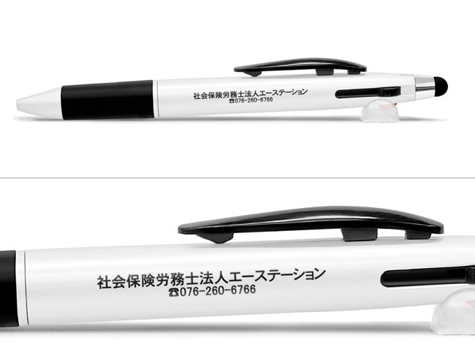 名入れボールペン市場のオリジナル商品 タッチペン付3色ボールペンに名入れ。ビジネスシーンでも活躍してくれるタッチペンの付いた3色ボールペン。多機能なのに比較的安価でご提供できるので企業様の広告・販促としてお使いいただくのにもお薦めです。本体色は3色の中からご選択可能ですが今回は本体色「おまかせ」頂きましたので印刷色の「黒」が映える「シルバー・ホワイト」の2色で作成しております。