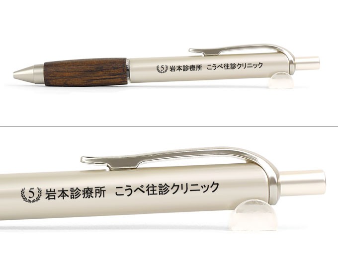 ピュアモルト500に名入れさせて頂きました。グリップ部分にウイスキー熟成後の樽材を再加工した味わいのある木を使い作られた木製ペンのピュアモルト。木の感触がペンを握った手にやさしいぬくもりを与えてくれる心癒されるボールペンです。5周年の記念品として配布するとのことでしたので