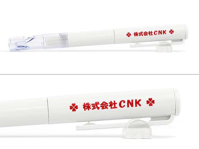 弊社オリジナルのホイッスル付ライトペンへ名入れさせて頂きました。ボールペンにLEDライトとホイッスルが付いていますので暗い夜道の一人歩きに万が一のことがあれば笛を吹いて自分の居場所を知らせたり、災害や停電などの緊急時に役立つ商品です。会社名の両サイドにイラスト(343)を入れることにより優しく暖かな感じに仕上がっています。OPP(ナイロン製透明袋)を添付させて頂き納品致しました。