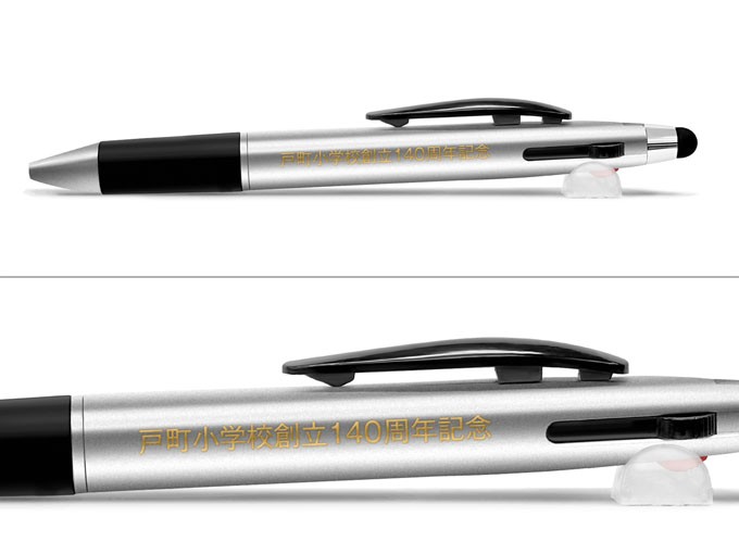 今回名入れボールペン市場にご注文頂いたのはスマホやタブレットの操作に便利なタッチペンが付いているのでビジネスシーンはもちろんプライベートでも使える弊社オリジナルのタッチペン付3色ボールペンです。シルバーの本体色に金での名入れは記念品に相応しい高級感あふれる仕上がりになっています。のし箱を添付させて頂き納品致しました。