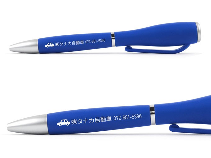 災害や停電、暗がりでのサインや書類の記入などに便利なLEDライトが付いた弊社オリジナルLEDフラッシュライトボールペン スエード調へ名入れさせて頂きました。ボディはスエード調加工を施していますので握り心地がとても良いです。今回は車のイラストを入れさせて頂きましたので一目で職種が分かる仕上がりになっています。更に白での印刷は文字が映え宣伝効果バツグンの名入れペンになっています。OPP(ナイロン製透明袋)を添付させて頂き納品致しました。