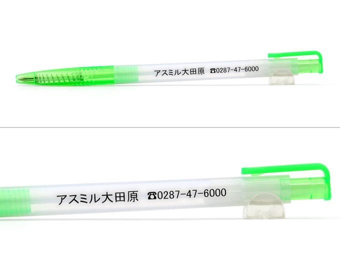 今回ご注文頂きました商品は弊社オリジナル商品のスリムラインボールペン。名入れボールペン市場イチオシの激安販促ボールペンです。半透明なボディとカラフルなグリップがかわいくカラーバリエーションも6色と豊富です。書体を角ゴシックにすることでどなたにも社名が見やすくシンプルな仕上がりになりました。