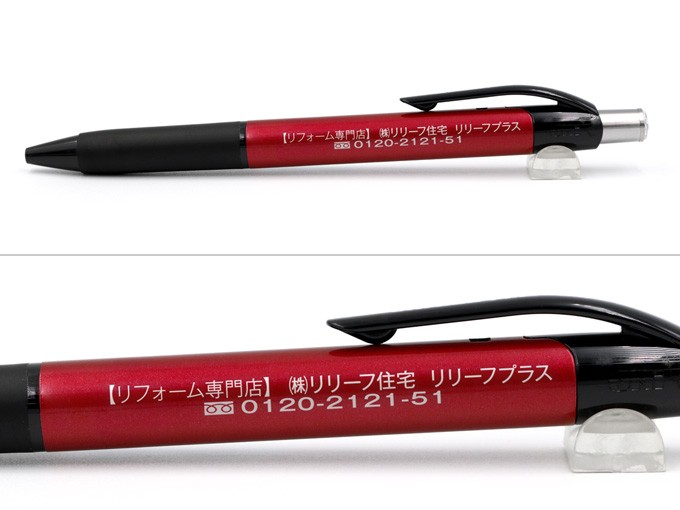 何度でも消して書き直すことが出来る三菱uniのユニボールRE(アールイー)メタリック塗装0.5㎜へ名入れさせて頂きました。筆記時は一般的なノック式ボールペンと同様に、ペン先を下に向けノックすると筆記ができます。消去するときは軸を逆さにする事で内蔵されている”ロック機構”が作動して消し具を固定してくれるのでしっかりと消すことが可能です。メタリック調のボディに白での印刷は名入れが映えカッコイイ仕上がりになっています。今回はのし箱にも印刷させて頂き納品致しました。