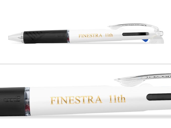 国産ボールペン人気ナンバーワンの三菱uni。くせになるなめらかな書き味でおなじみのジェットストリーム3色インク 0.5㎜です。世界初の画期的な新開発インクを搭載し、油性でありながら水性のような書き味を実現しました。今回は、11周年記念との事で、シンプルに『FINESTRA 11th』のみで作成致しました。記念品としてお配りする際に便利なOPP袋をお付け致しました。