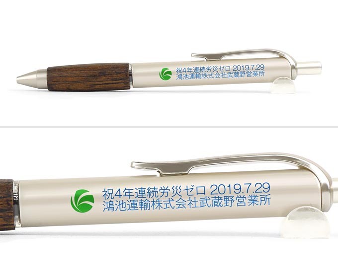 国産人気メーカー三菱uniのピュアモルト500へ名入れさせて頂きました。グリップ部分にウイスキー熟成後の樽材を使い、味わいのあるボールペンです。天然素材を使用してるため1つ1つの木目や色味が少しづつ変わる味わい深い1本。他にはない商品ですので会社の周年記念品やプレゼントとしても喜ばれます。印刷方法につきましては、印刷範囲が広く取れますPAD印刷で対応させて頂き、2色印刷で作成させて頂きました。印刷内容が映えとてもカッコイイ仕上がりになっています。梱包は化粧箱とOPP袋(ナイロン製透明袋)を添付させて頂きました。