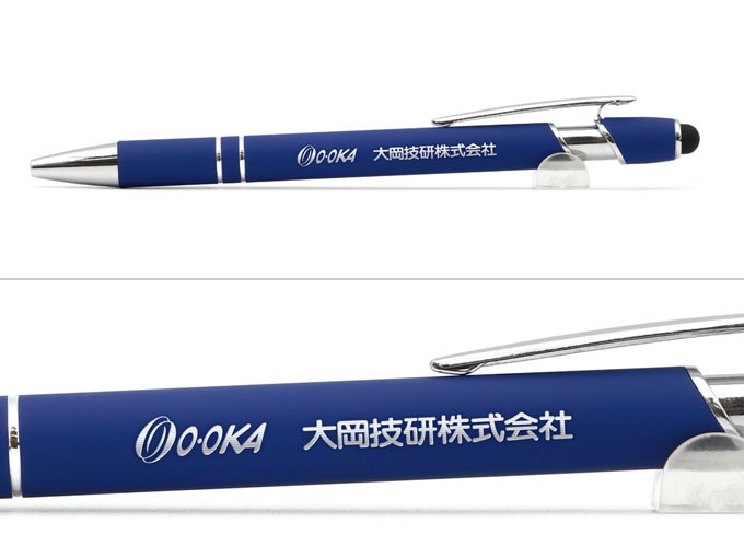 今回ご注文頂きました商品は弊社オリジナル商品レーザー彫刻 タッチペン付メタリックONE-DX 0.7mmです。インクはオリジナルの【書き味なめらかインク】を搭載で某国産ボールペンに引けをとらない書き心地を実現しました。スマートフォン、タブレットの操作に欠かせない便利なタッチペン付きで画面を操作できない時に持っていると便利だと好評です。今回はデータ入稿にて会社ロゴを頂いております。本体の銀の金具部分とレーザー彫刻の文字の色がマッチしていて一体感のある仕上がりになりました。OPP袋(添付)で納品させて頂きました。