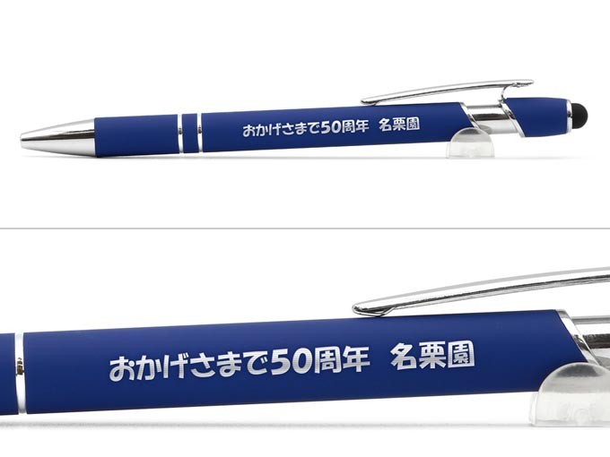 弊社オリジナル商品レーザー彫刻 タッチペン付メタリックONE-DX 0.7mmへ名入れさせて頂きました。大人気メタリックONEシリーズからスマホ操作に便利なタッチペン機能が付いたNEWバージョンが登場しました。エマルジョンタイプインク搭載で、なめらかな書き心地を実現しております。レーザー彫刻ですと、彫る形になりますので、半永久的に文字が残ります。書体をPOP体にすることで明るさ、親しみやすさが感じられる仕上がりになりました。のし箱印刷をプラスすると更に記念品として引き立ちます。