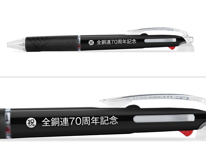 油性でありながら水性のような滑らかな書き味が大好評の三菱uniジェットストリーム2&1 3機能ペン 0.5mmへ名入れさせて頂きました。ボールペンもシャープペンも芯の太さは0.5mmとなっておりますので、手帳、メモ書き等にも使いやすいです。名入れの書体をおまかせで頂きましたので、見やすい角ゴシック体で名入れさせて頂きました。イラストが入ることで更に70周年記念が引き立ちます。のし箱にも印刷させて頂きました。