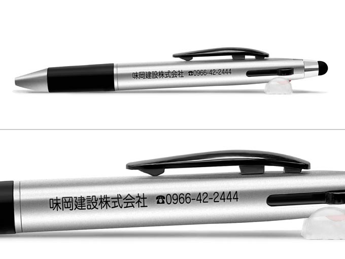 今回名入れボールペン市場にご注文頂いたのは弊社オリジナルのタッチペン付き3色ボールペン 0.7mmです。スマホやタブレットの操作に便利なタッチペンが付いていますので、ビジネスシーンでお使いになるのに最適なボールペンです。またノベルティや粗品等でお配りになるのにも抜群の商品です。会社名と電話番号が大きく印刷されていますので、企業のPRに抜群の販促品に仕上がりました。ボールペンはのし箱に入れさせて頂き納品致しました。