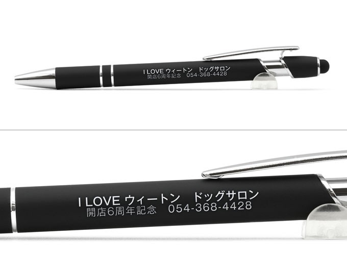 弊社オリジナル商品レーザー彫刻名入れボールペン|タッチペン付きメタリックONE-DX 0.7mmへ名入れさせて頂きました。人気No1のメタリックONEシリーズにタッチペン機能を搭載したNEWバージョンが登場しました。【書き味なめらかインク】にスマートフォンやタブレット等の画面操作に使うタッチペンが付いていますので手袋などをしている時にも便利と好評です。今回は印刷方法を『レーザー彫刻』で頂いております。印刷範囲が広く取れますので、20文字以上の文字数でも潰れることなく綺麗に仕上がりました。社名を少し大きくすることで、目立たせることが出来ました。