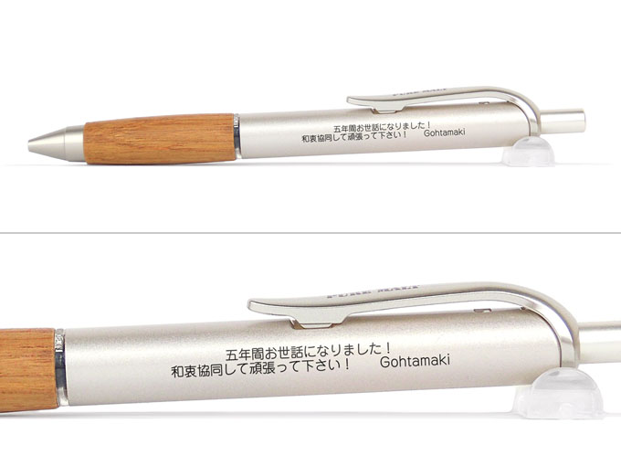 三菱鉛筆(uni)ピュアモルト500 0.5mmへ名入れをさせて頂きました。比較的リーズナブルで高級感の感じられるボールペンなので、記念品やプレゼントとして大変人気があります。木のやさしいぬくもりを与えてくれる心癒されるボールペンです。グリップ部分はウィスキーの樽で出来ているので、同じものがないのが特徴です。今回文字数が多かったので一文字一文字は小さくなってしまいましたが文字が潰れることなく綺麗に名入れで来ました。ネイビー化粧箱にお入れして納品させて頂きました。