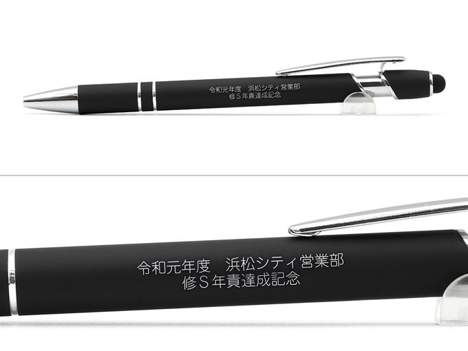 今回ご注文を頂きました商品は弊社オリジナルボールペンのレーザー彫刻名入れボールペン|タッチペン付きメタリックONE-DX 0.7mmです。メタリックONEシリーズにタッチペン機能を搭載したスエード調加工のペンです。スマートフォン、タブレットの操作にも便利なタッチペン付きで手袋をしたまま使用することが出来ます。レーザー彫刻ですので文字数も多く入れることができ、半永久的に文字が残ります。ギフトに最適でオシャレなネイビー化粧箱にお入れして納品させて頂きました。