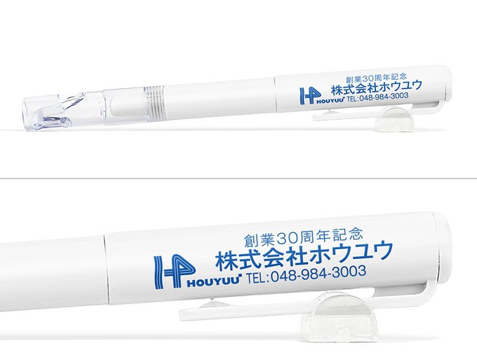 今回名入れをさせて頂いた商品は弊社オリジナルボールペンのホイッスル付きライトペン 0.7mmです。ボールペンにLEDライトとホイッスルの3機能が付いたとても便利な商品です。セパレートで使えますので、暗所での作業時のライト代わりや突然の停電時などに慌てずに済みます。夜の散歩時にもいざという時の防犯にも使えますので一本あると安心です。今回は印刷範囲が広く取れるPAD印刷で名入れを致しましたので、三行校正でも文字が潰れずにサイズ内におさまりました。なかでも社名を他より大きくするとメリハリができ見やすくなりました。