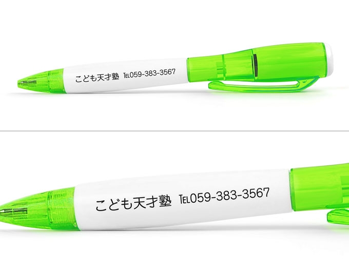 ボールペンにLEDライトが付いた弊社オリジナルボールペン、LEDフラッシュライトボールペン 0.7mm パステルに名入れ致しました。防災グッズの意識が高くなっている最近では、手軽に持ち出せて場所も取らないという大変便利なボールペンが人気です。いざという時や暗い場所での探し物にはこれ一本あれば安心です。塾の生徒さんたちは暗い時間に帰路につくので、お守り代わりにプレゼントされると喜ばれる事間違いないです。白軸に黒文字が非常に見やすく宣伝効果にもピッタリです。配布時に便利なOPP袋をお付けいたしました。
