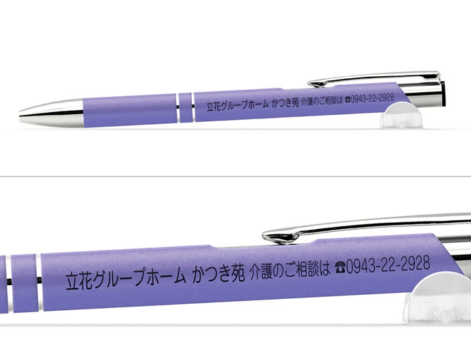 弊社オリジナルボールペンから大人気メタリックONEシリーズのメタリックONE パステル 0.5mmへ名入れをさせて頂きました。5色展開の淡いパステルカラーが何ともさわやかで、ペンの芯も0.5mmと細めなので、特に女性スタッフの多い企業様よりご依頼を多く頂いております。本体カラーが淡いので、文字色を濃いお色で入れると印刷文字がグッと目立ちますので、お勧めです。今回は30文字以上の名入れでしたが、文字の大きさに変化を付けたことで綺麗におさまりました。