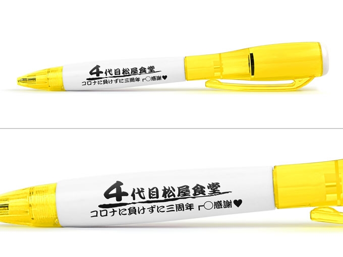 弊社オリジナルボールペン、LEDフラッシュライトボールペン 0.7mm パステルへ名入れ致しました。ボールペンに明るいLEDライトが付いた可愛らしいパステルカラーが人気で、防災グッズの意識が高くなっている最近では、色々な方へお渡しするのにおすすめの名入れペンです。今回のように印刷範囲が広く取れるPAD印刷ですと白軸ボディにドーンと大きくロゴやメッセージを入れることが出来るので、企業名や店名等のアピールにも繋がります。配布時に便利なOPP袋に入れて納品させて頂きました。