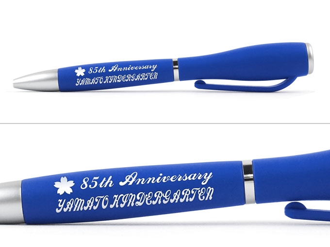 弊社オリジナルボールペン、LEDフラッシュライトボールペン 0.7mm スエード調へ名入れ致しました。LEDライト付きボールペンの中ではカジュアルなデザインで、さらさらとしたスエード調が特徴です。防災意識が高くなっている近年ではこのような商品がノベルティや販促品としてお渡しすると喜ばれます。印刷範囲が広く取れるPAD印刷ですとロゴやメッセージ等も大きく入りますので企業や団体のアピールにもつながります。今回のように周年記念品としてお渡しされると防災と併せて二度嬉しいギフトとなる事間違いないです。お渡し時に便利なのし箱を添付させて頂きました。